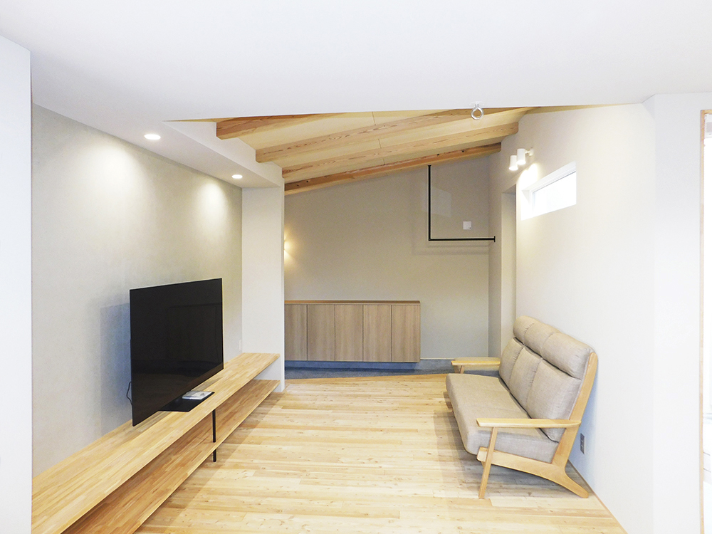 ·木の温もりが溢れる勾配天井と化粧梁で立体的な空間を演出したリビング。