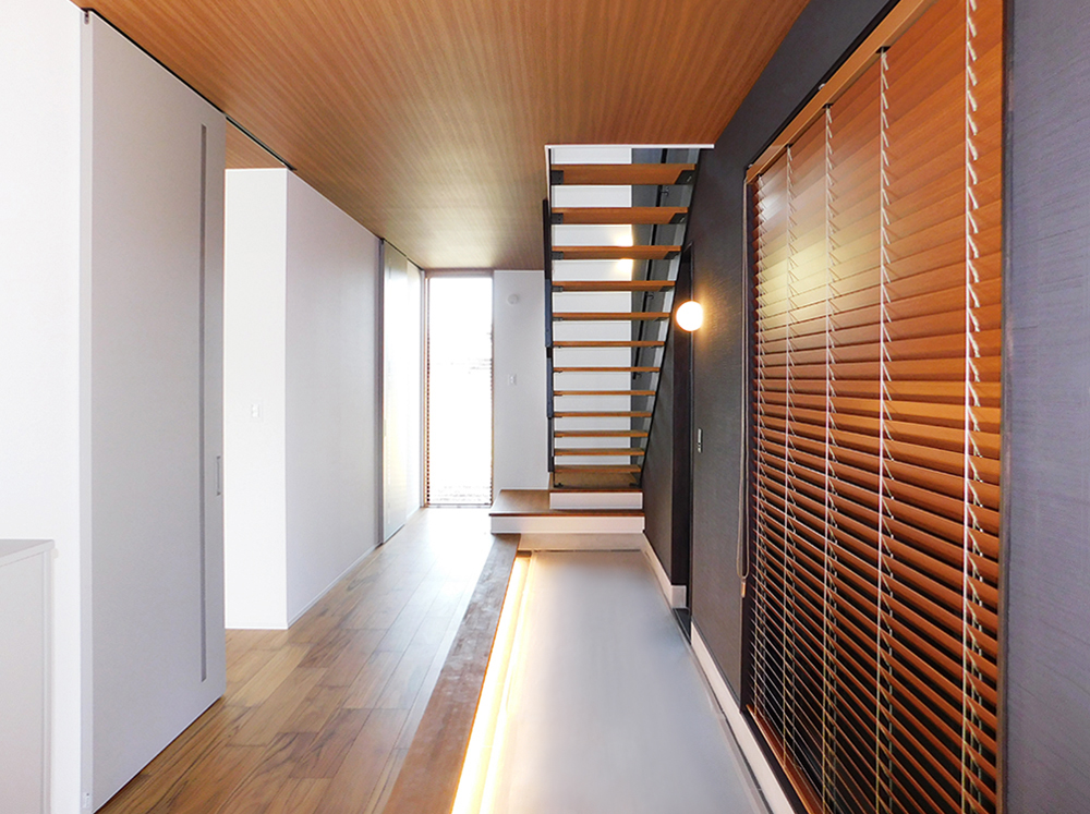 ・開放的な空間を演出する長い玄関土間とスケルトンの鉄骨階段。