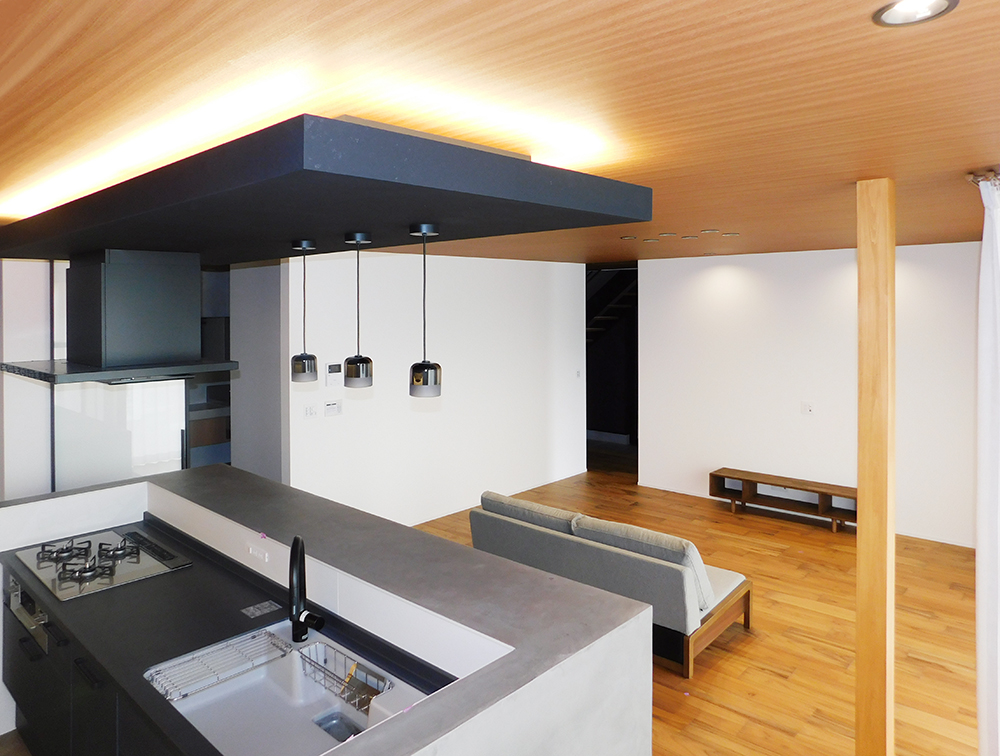・下がり天井で空間をゆるやかに仕切り、間接照明によってオシャレ感を演出したキッチン。