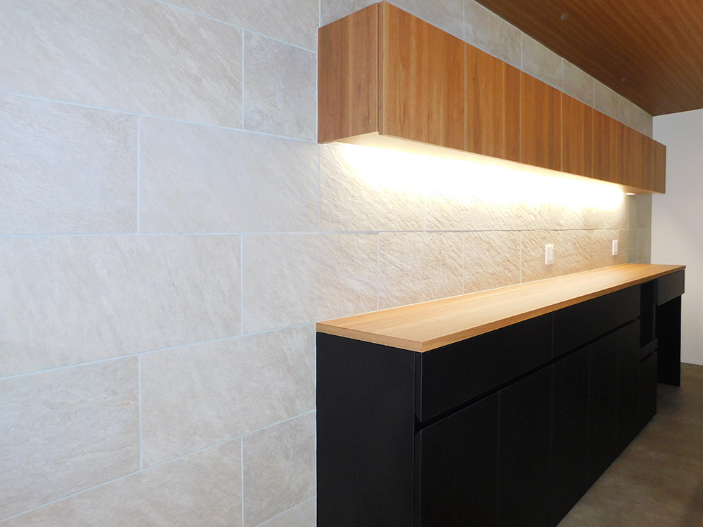 ・タイルを貼ったこだわりのキッチン背面スペース。