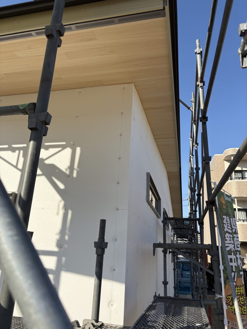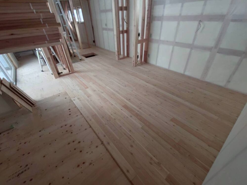 中庭にある和テイストな家無垢の軒天材と床を施工中◎