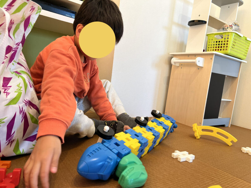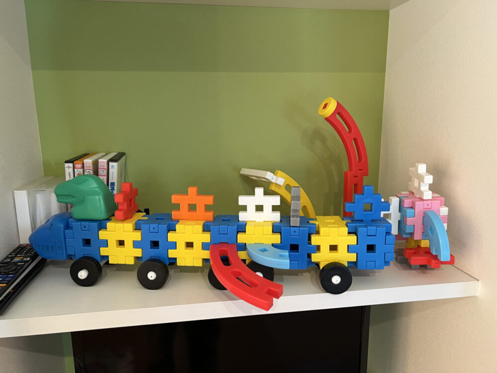 新しいブロックのおもちゃで新幹線を作ったり、車を作ったりして楽しんでいました。