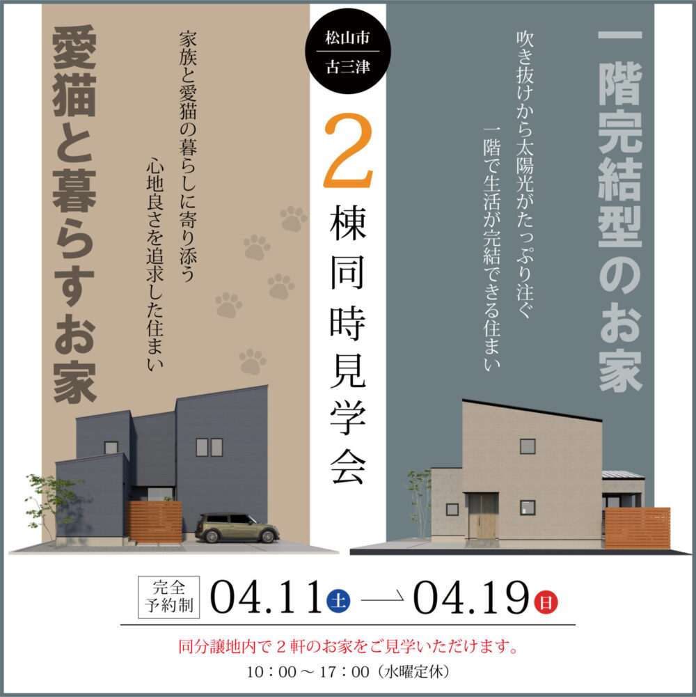 さて、今週末には松山市古三津にて2棟同時完成見学会が開催されます!